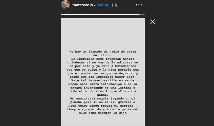 "No hay un llamado de nadie del parte del club. Es increíble cómo inventan tantas boludeces. Si me voy de Estudiantes no es por esto y yo vine porque yo quise, y lo hice posible porque el United no me quería dejar ir y desde acá era imposible hacer algo", escribió en su cuenta de Instagram.