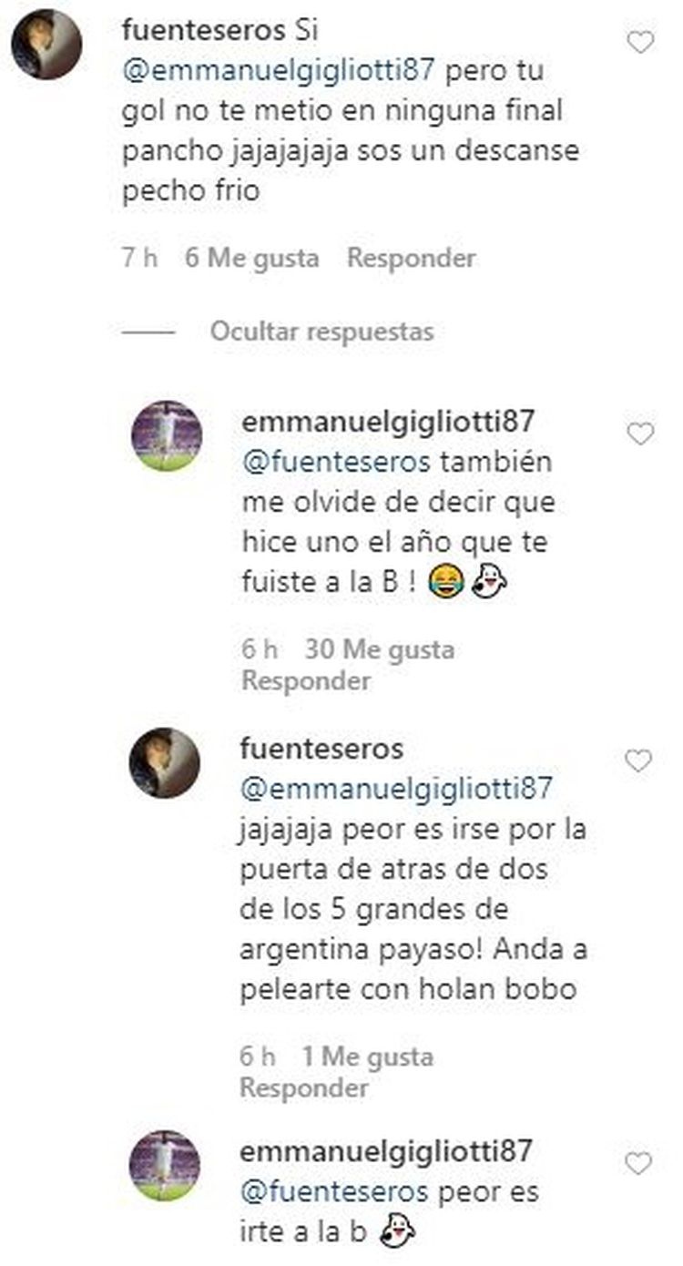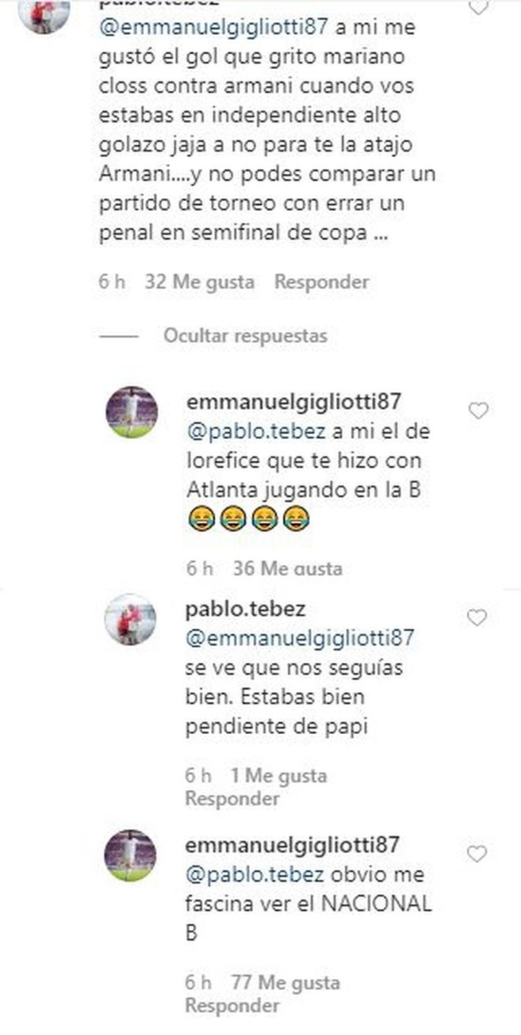 El usuario Pablo.tebez le dijo "A mí me gustó el gol que gritó Mariano Closs contra Armani cuando vos estabas en Independiente alto golazo jajaja ah no para, te la atajó Armani... y no podés comparar un partido de torneo con errar un penal en semifinal de copa...", a lo que Gigliotti retrucó "A mí el de Lorefice que te hizo con Atlanta jugando en la B". Pablo no se achicó y puso: "Se ve que nos seguías bien. Estabas bien pendiente de papi". Y el Puma volvió a responder: "Obvio me fascina ver el NACIONAL B".