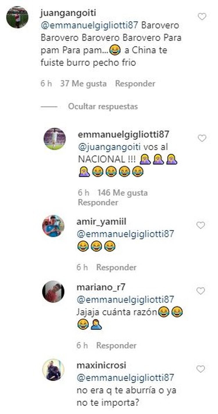 La segunda respuesta de Gigliotti fue para juangangoiti, quien le escribió: "Barovero, Barovero, Barovero, para pam, pam, pam. A China te fuiste burro pecho frío”. La respuesta del Puma, ya sin argumentos, fue: "Vos al NACIONAL!!!".