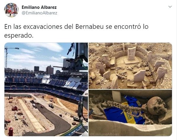 El tuitero @EmilianoAlbarez compartió las imágenes de un supuesto esqueleto con la camiseta de Xeneize encontrado en las excavaciones del estadio Merengue y en pocos minutos se volvió viral. "En las excavaciones del Bernabeu se encontró lo esperado", bromeó el usuario y generó un nuevo capítulo de mensajes entre los hinchas de ambos clubes.