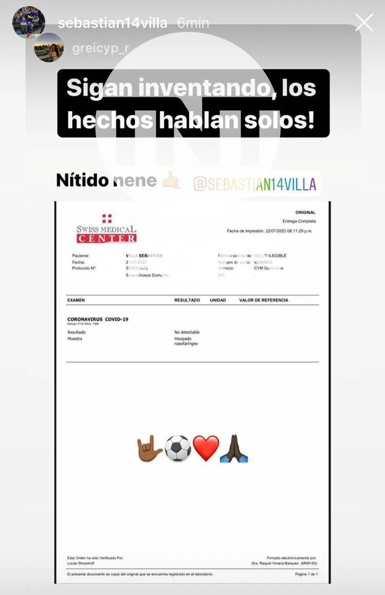 La foto mostrada dice en el resultado "no detectable" y especifica que se hizo un "hisopado nasofaríngeo". Es la segunda oportunidad en la que Villa se realiza el testeo. La primera oportunidad fue el 30 de junio y el resultado fue el mismo. Villa se encuentra en Argentina ya que no puede salir del país por su situación judicial tras la denuncia por violencia de género.