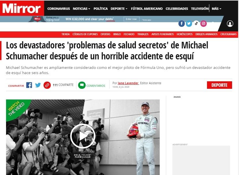 Sin embargo, este sábado el reconocido medio británico Mirror reveló algunas de las consecuencias que le ha dejado el accidente al alemán en un artículo titulado "los devastadores problemas de salud secretos de Michael Schumacher después de un horrible accidente de esquí".