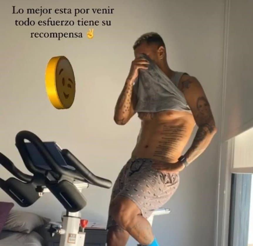 Cardona subió a las historias de su cuenta de Instagram una imagen en la que se lo ve entrenando en una bicicleta fija mientras se seca la transpiración de la cara con la remera, dejando ver sus abdominales para dejar en claro que está en forma.