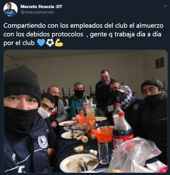 "Compartiendo con los empleados del club el almuerzo con los debidos protocolos, gente que trabaja día a día por el club", escribió Straccia en el tweet que luego fue borrado.