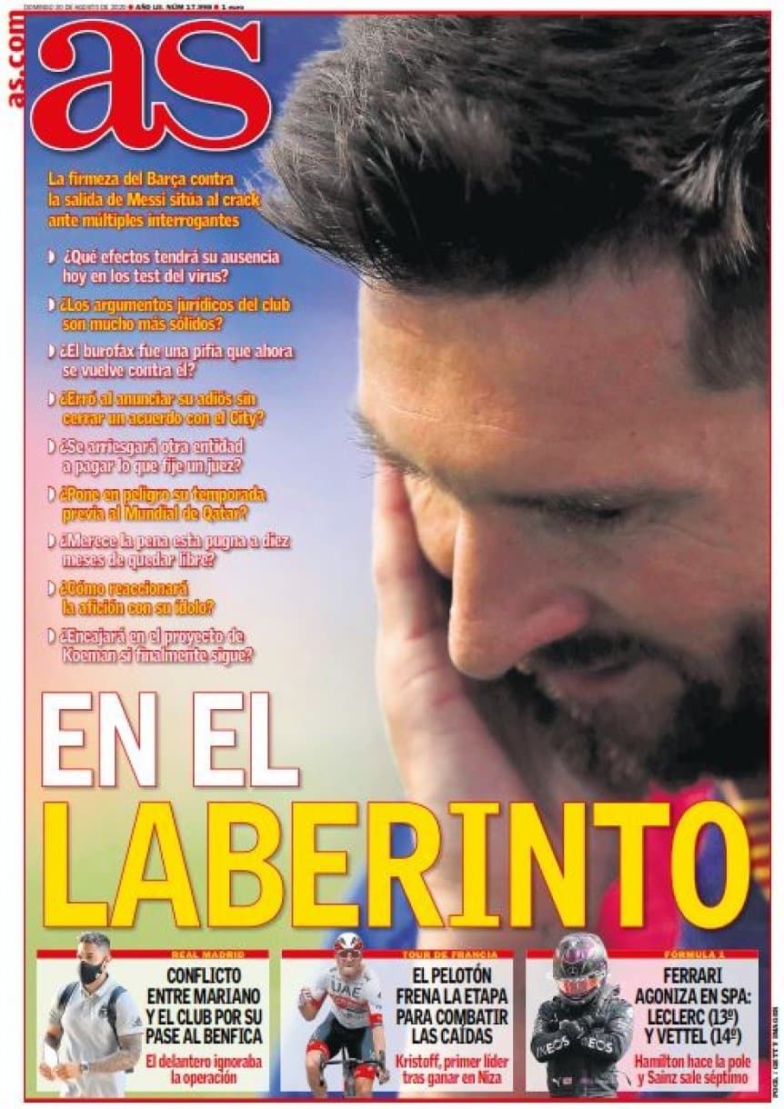 La decisión de Messi de dejar el Barcelona es, sin duda alguna, el tema del año. Por eso este domingo, una vez más, la Pulga volvió a ser el protagonista de las tapas de los principales diarios deportivos de España.