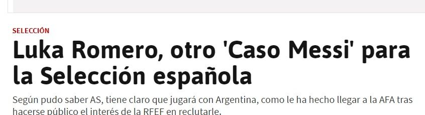 Luka Romero, nacido en México, hijo de argentinos y jugador del Mallorca, no aceptó el ofrecimiento que le realizó la Comisión Gestora de la Real Federación Española de Fútbol (RFEF) para jugar en el seleccionado de España y reafirmó que lo hará para Argentina, informó hoy la prensa ibérica.