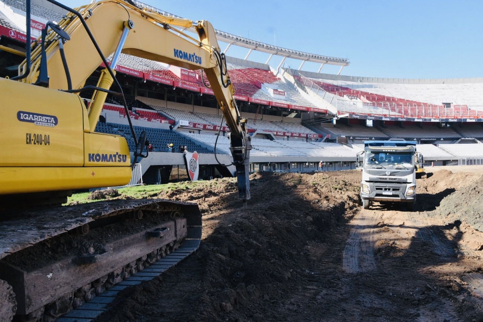 Ya se demolió la pista de atletismo y se levantó todo el césped, y ahora se están realizando los trabajos de excavación ya que el campo de juego bajará su nivel y estará un metro y medio más abajo, para darle lugar a la ampliación de las tribunas que estarán más cerca de la cancha.