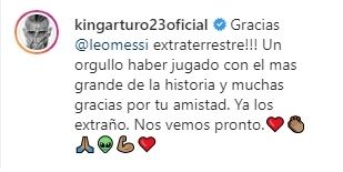 "¡Gracias extraterrestre! Un orgullo haber jugado con el más grande de la historia y muchas gracias por tu amistad. Ya los extraño. Nos vemos pronto", contestó Vidal a Messi en su publicación de Instagram.