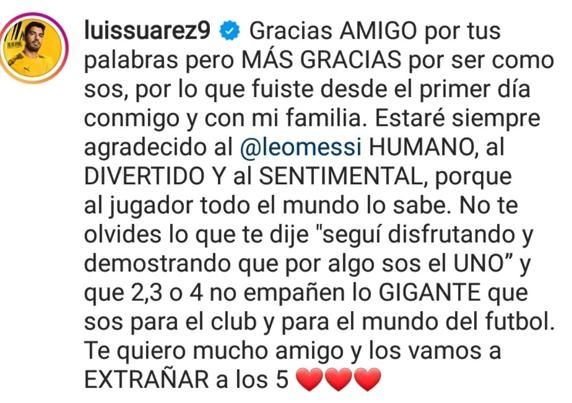 En su publicación en Instagram, el capitán del Barcelona le agradeció a Suárez por los momentos vividos y le deseó lo mejor en su nueva etapa, asegurando que el charrúa no merecía ser echado como lo hicieron y, además, destacando que ya no le sorprende nada cómo están manejando el club.