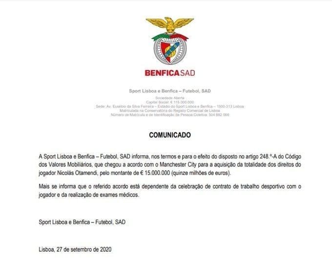 Los acuerdos están y según el comunicado elevado esta noche por el club portugués, "los cierres definitivos de estas transferencias estarán supeditados a las revisiones médicas y las firmas de los contratos de ambos futbolistas". Será el quinto club en la carrera de Otamendi tras sus pasos por Vélez, Porto, Valencia y Manchester City.