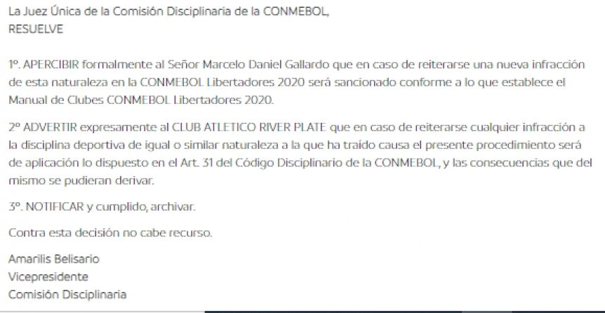 "Apercibir formalmente al señor Marcelo Daniel Gallardo que en caso de reiterarse una nueva infracción de esta naturaleza en la Conmebol Libertadores 2020 será sancionado. Por una segunda o subsiguiente infracción: suspensión por un partido y multa que no será inferior a 50.000 dólares", dice el documento. Esta es la primera falta del equipo argentino en la edición 2020.