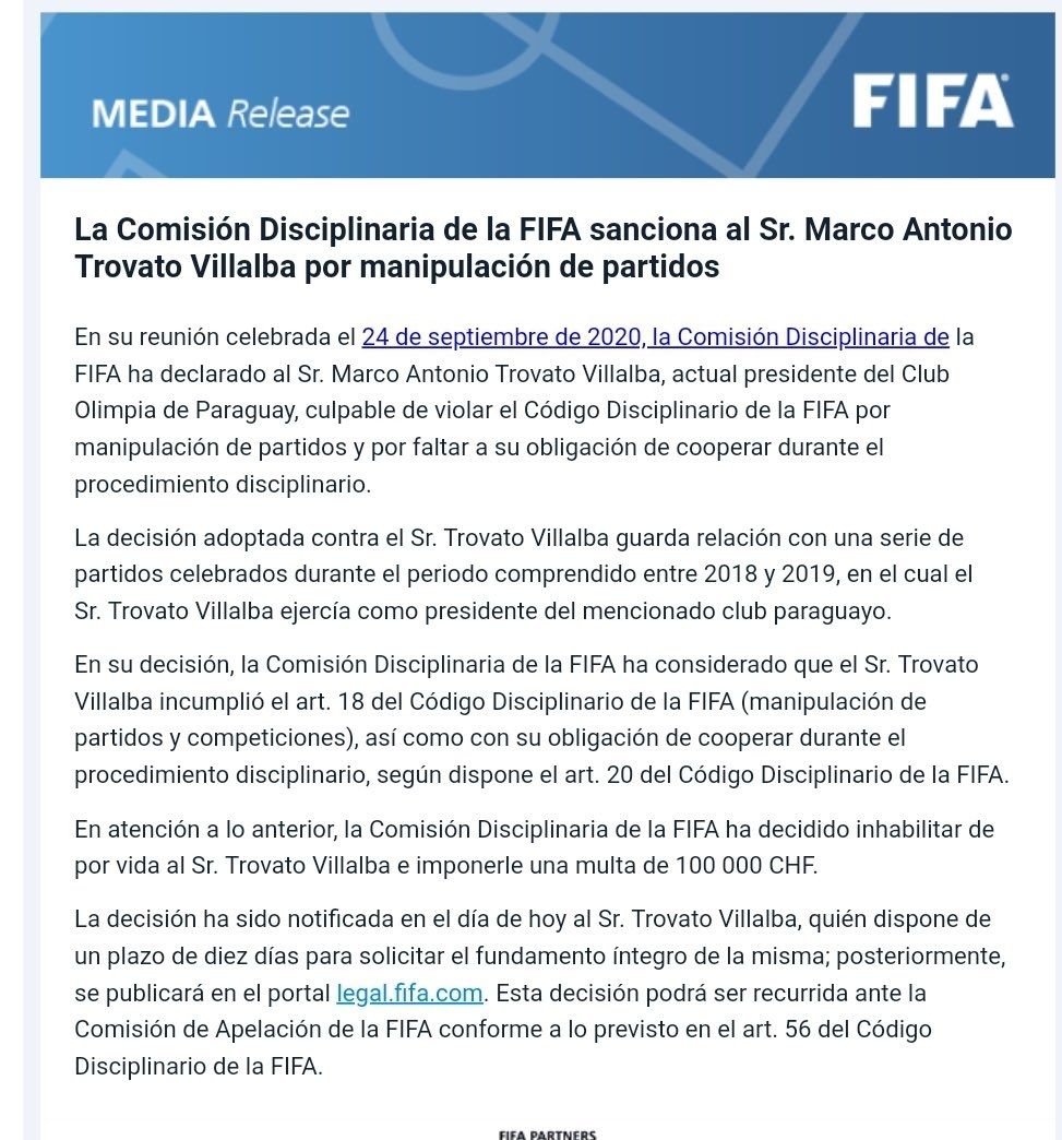 Marco Antonio Trovato Villalba, de 41 años, que dirigía a Olimpia desde el 24 de julio de 2014, según el comunicado de FIFA, está acusado de violar el Código Disciplinario de la entidad "por manipulación de partidos y faltar a su obligación de cooperar durante el procedimiento disciplinario. Por ello se dispone inhabilitar de por vida al señor Trovato e imponerle una multa de cien mil francos suizos (110.000 dólares)".