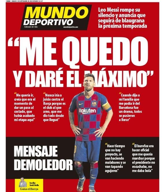 "Me quedo y daré el máximo", tituló el diario catalán Mundo Deportivo en una tapa de color rojo con la foto de Leo. Además, destacó más abajo: "Mensaje demoledor", dándole lugar a las principales críticas que hizo Messi sobre la dirigencia del club.
