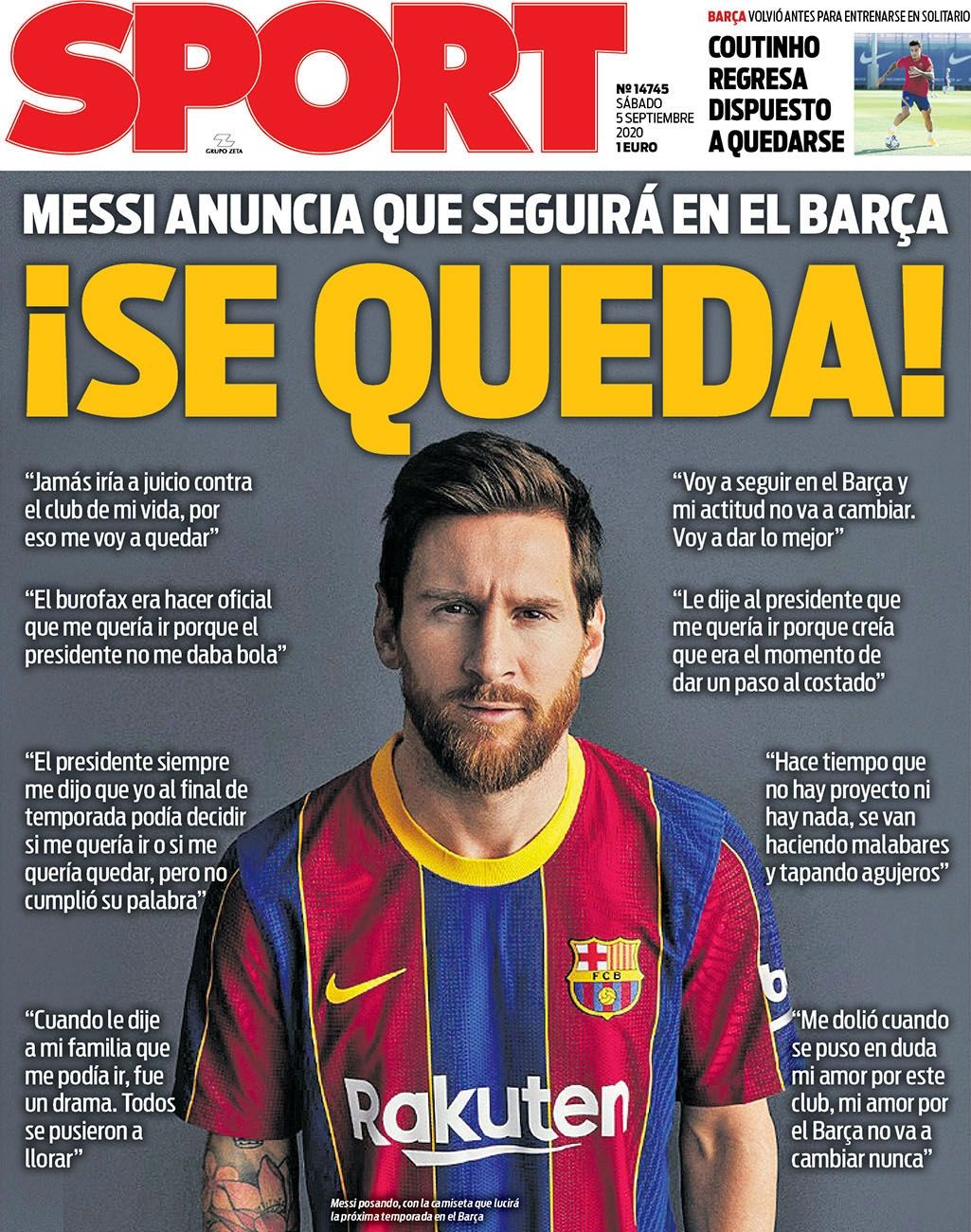 "¡Se queda!", destacó otro de los diarios de la Ciudad Condal, Sport, que eligió una foto de Messi con fondo gris y también le dio lugar a las principales frases del crack argentino, sobre todo en las que le pegó a la cúpula Culé.