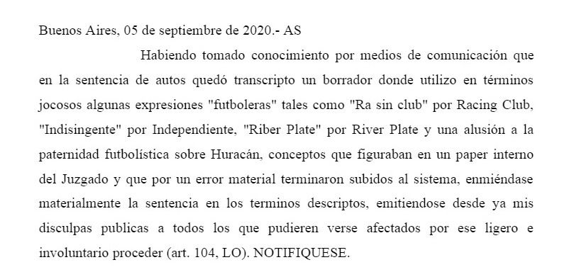 "Habiendo tomado conocimiento por medios de comunicación que en la sentencia de autos quedó transcripto un borrador donde utilizo en términos jocosos algunas expresiones 'futboleras' tales como 'Ra sin club' por Racing Club, 'Indisingente' por Independiente, 'Riber Plate' por River Plate y una alusión a la paternidad futbolística sobre Huracán, conceptos que figuraban en un paper interno del Juzgado y que por un error material terminaron subidos al sistema, enmiéndase materialmente la sentencia en los términos descriptos, emitiéndose desde ya mis disculpas públicas a todos los que pudieren verse afectados por ese ligero e involuntario proceder", se justificó.