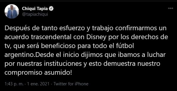 "Después de tanto esfuerzo y trabajo confirmamos un acuerdo trascendental con Disney por los derechos de televisación, que será beneficioso para todo el fútbol argentino", indicó esta tarde Claudio Tapia, presidente de la AFA, en su cuenta de Twitter. "Desde el inicio dijimos que íbamos a luchar por nuestras instituciones y esto demuestra nuestro compromiso asumido", completó.