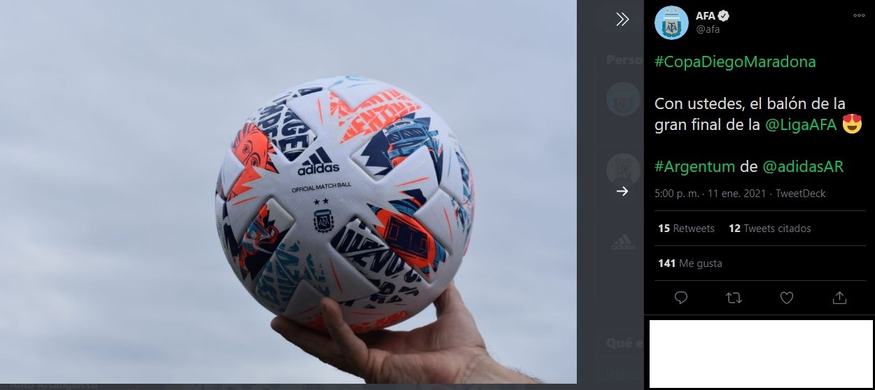 En este contexto, la AFA publicó la pelota que se utilizará para la final. "Con ustedes, el balón de la gran final de la @LigaAFA", manifestó en una publicación de Twitter.