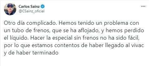 "El de hoy ha sido un tramo complicado para nosotros. Uno de los frenos se aflojó, perdimos el líquido e hicimos la especial con la parte de atrás sin frenos y con poquito delante. Ha sido muy difícil", dijo el madrileño, último ganador del Rally Dakar en la categoría de coches, que 1h02m25s de su compañero en MINI, Stéphane Peterhansel.