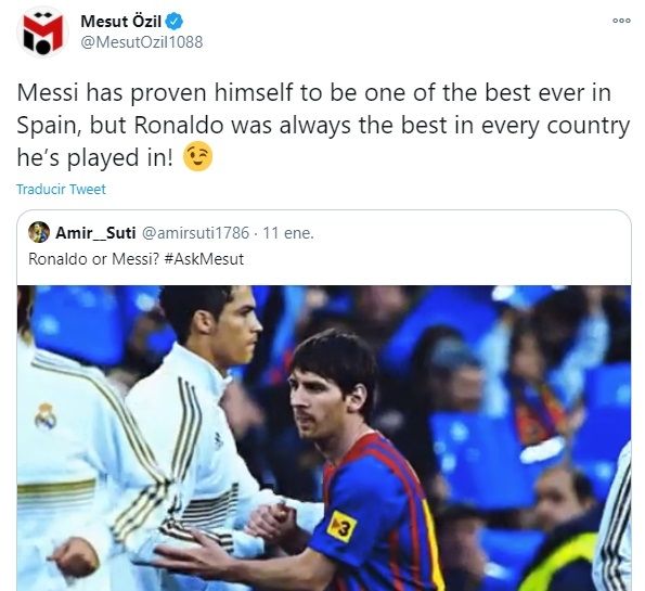 "Messi ha demostrado ser uno de los mejores en España, pero Ronaldo siempre fue el mejor en todos los países donde ha jugado", dijo y su respuesta ha sido aplaudida, y criticada, a partes iguales por el universo Twitter. Özil, jugó con Cristiano en el Real Madrid y además fue rival de Messi en los Clásicos de España o mismo en el Argentina-Alemania del Mundial 2014.