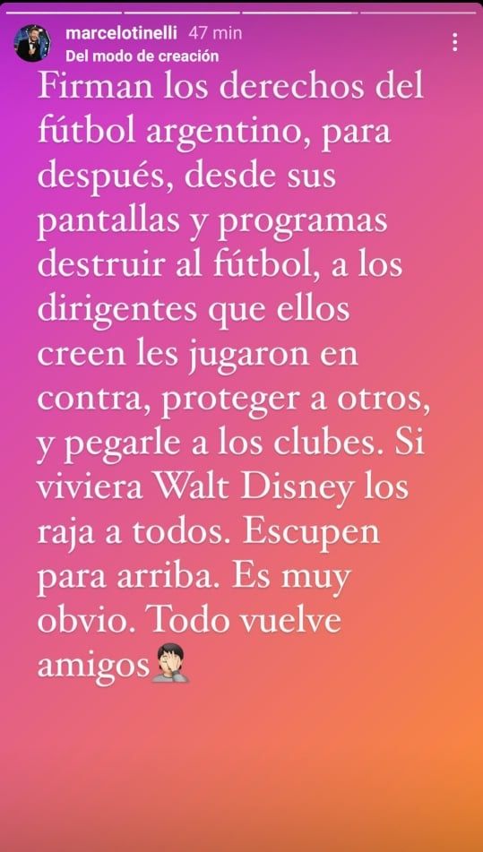 "Firman los derechos del fútbol argentino, para después, desde sus pantallas y programas destruir al fútbol, a los dirigentes que ellos creen les jugaron en contra, proteger a otros, y pegarles a los clubes", escribió Tinelli en una storie de Instagram. "Si viviera Walt Disney los raja a todos. Escupen para arriba. Es muy obvio. Todo vuelve, amigos", cerró el empresario.