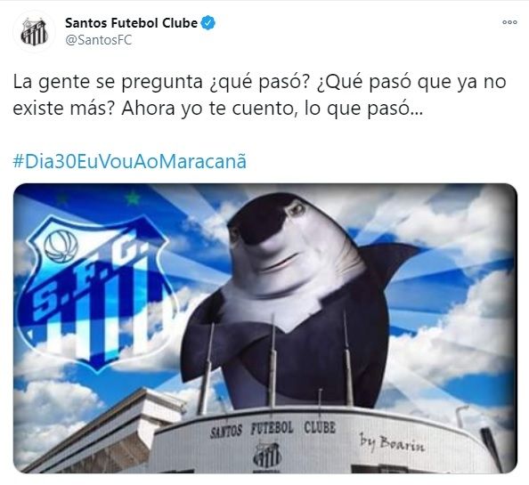 "La gente se pregunta ¿qué pasó? ¿Qué pasó que ya no existe más? Ahora yo te cuento, lo que pasó...", tuiteó el Santos en su cuenta oficial junto a la imagen de un tiburón en su estadio y un hashtag haciendo alusión a la final del próximo 30 de enero en el mítico estadio de Río de Janeiro.