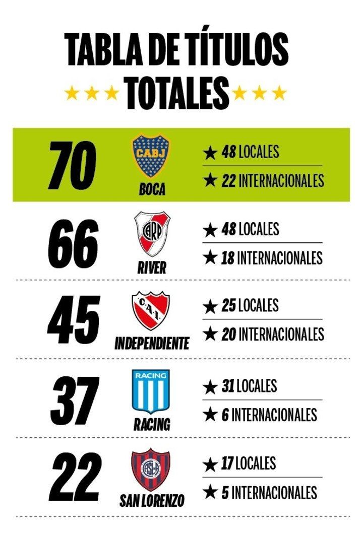 De esta manera, el Xeneize se ratifica como el club con más títulos oficiales del país, ubicándose a cuatro de su clásico rival, River, y obteniendo una amplia ventaja sobre Independiente y Racing.