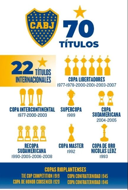 Boca suma 22 títulos internacionales, entre los que tiene seis Libertadores, tres Intercontinentales, una Supercopa, dos Sudamericanas, cuatro Recopas Sudamericana, una Copa Master y una Copa de Oro Nicolás de Leoz. Además se cuentan cuatro copas rioplatenses.