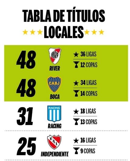 En tanto que en el total de títulos locales empata con el Millonario en 48, producto de la suma entre ligas y copas nacionales.