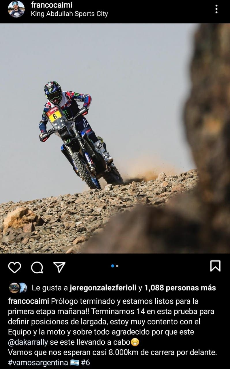 En motos, Franco Caimi aparece en la posición 14 y en su cuenta de Instagram expresó sus sensaciones: "Estamos listos para la primera etapa. Estoy muy contento con el equipo, la moto. Vamos que nos esperan casi 8.000 kilómetros de carrera por delante". El piloto de Yamaha acelerará a fondo a partir de las 3.10am de nuestro país.