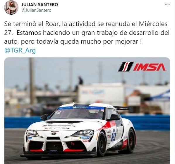 El piloto destacó hoy, a través de sus redes sociales, estar "haciendo un gran trabajo en el desarrollo del auto, pero todavía queda mucho por mejorar". La unidad que utilizará es atendida por Riley Motorsport, y compartirá el auto con los costarricenses Javier Quirós y Alfredo Najri, integrando el equipo Toyota Gazoo Racing Latinoamérica.