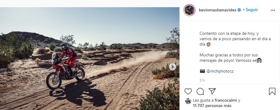 Kevin Benavides (Honda), que asume su quinta edición de la competencia, llegó segundo al término de un tramo cronometrado de 277 kilómetros, con una diferencia de 31 segundos respecto del ganador, el australiano Toby Price (KTM), campeón 2016 y 2019.