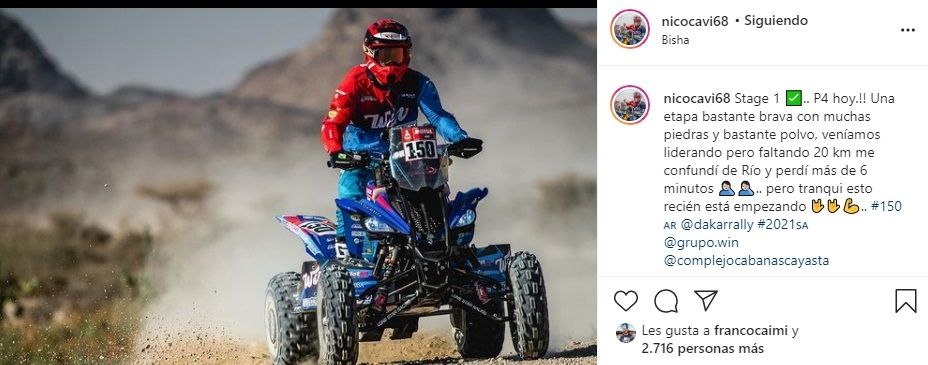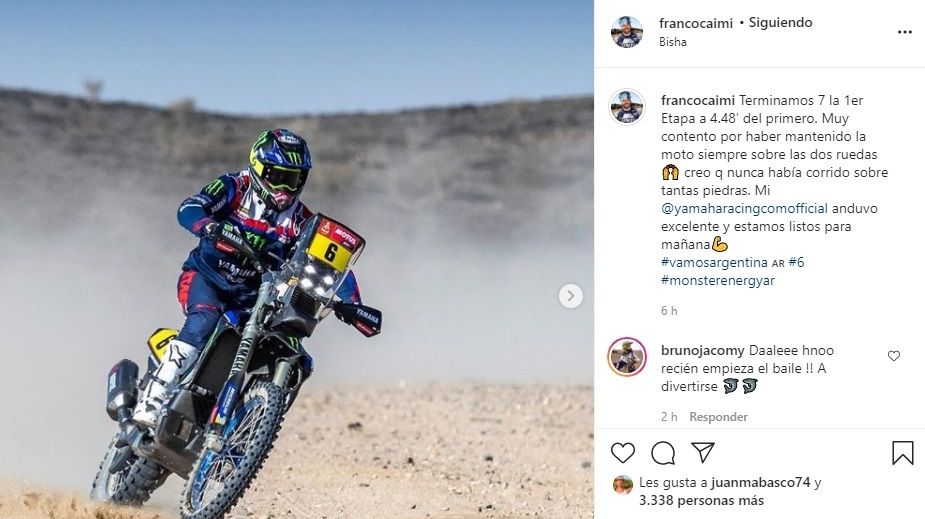 El mendocino Franco Caimi se posicionó en el séptimo lugar después de pilotear su Yamaha durante 3 horas, 23 minutos y 14 segundo, registro que lo dejó a 4m.48s. del australiano. Dos escalones por debajo de Caimi, en el noveno puesto, se ubicó Luciano Benavides (Husqvarna), cuyas expectativas en esta prueba también son altas después de quedar sexto el año pasado.