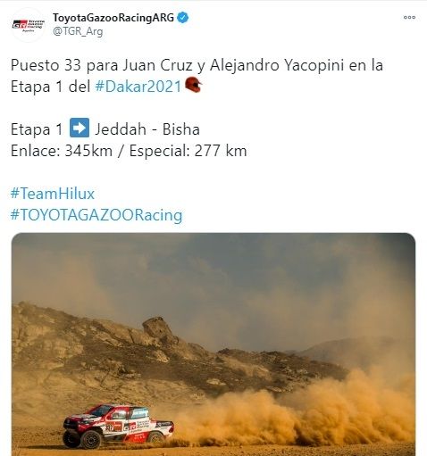 Juan Cruz Yacopini está debutando en este Dakar. Con la navegación de su padre Alejandro, un experimentado en la materia, el mendocino tiene como objetivo completar su primera travesía. En el prólogo realizado ayer culminó 38vo y en la primera etapa pudo avanzar hasta el puesto 33°.