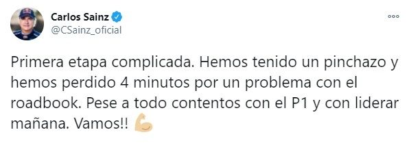 Nasser Al-Attiyah, ganador del prólogo de ayer, ha cruzado la línea de meta de la primera especial en 10ª posición a 12 minutos del vencedor Carlos Sainz. Un resultado que ya veía venir el piloto de Toyota. "Decidimos ganar el prólogo y sabíamos que íbamos a perder tiempo hoy abriendo pista, pero lo importante viene mañana. Estoy contento porque no hemos cometido errores".
