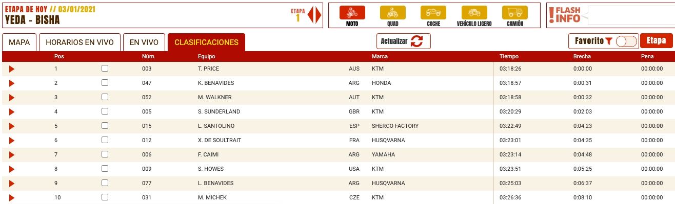 La primera apuesta estratégica de KTM ha funcionado. Sus pilotos ayer sacrificaron el prólogo y hoy han recogido el fruto en forma de victoria de etapa y liderato para Toby Price. Kevin Benavides terminó segundo en la etapa a apenas medio minuto del australiano. Además, buenas clasificaciones parciales para Walkner (3º) y Sunderland (4º).