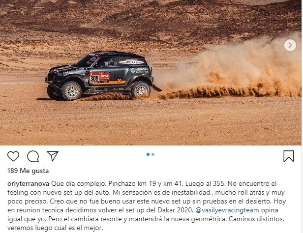 Una vez arribado al campamento explicó lo ocurrido y reveló una charla con el equipo para intentar cambiar el rumbo: "Las etapas son bonitas, duras, pero en lo personal el auto se hace difícil de conducir. No encontramos el camino de la puesta a punto. Mi sensación es de inestabilidad,, mucho roll atrás y muy poco preciso".