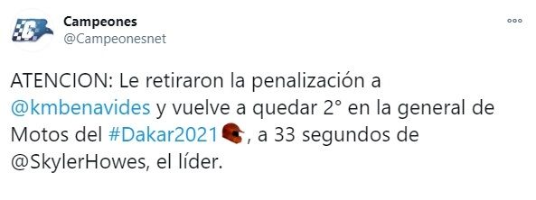 Luego de llegar segundo a la meta de la tercera etapa, un rulo de 403 kilómetros en Wadi Ad-Dawasir, Kevin Benavides había sufrido una penalización de dos minutos por no respetar una zona de control de velocidad, algo que luego quedó sin efecto según informó el sitio Campeones. Ante esto, el salteño sigue siendo escolta de Skyler Howes en la categoría motos.