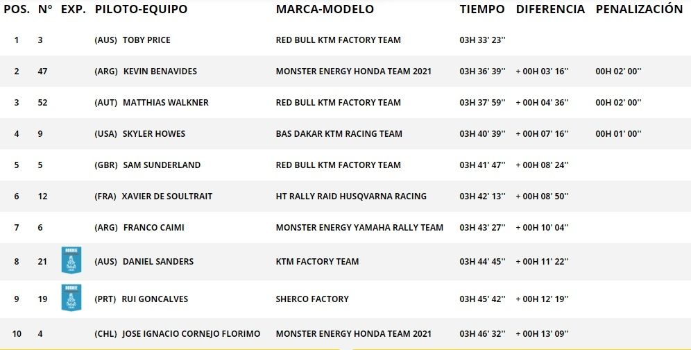 El motociclista australiano Toby Price logró se adjudicó hoy su segunda etapa en la presente edición del Rally Dakar al ganar la tercera jornada de la competencia, disputada en Wadi Ad-Dawasir, con una gran actuación tras partir en la 29ª posición. El dos veces campeón de la travesía logró ubicarse rápidamente detrás del argentino Kevin Benavides.