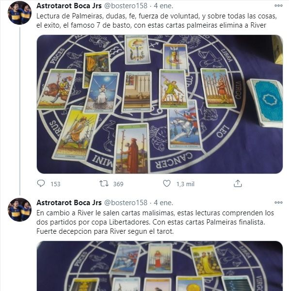 Luego, sobre el Millonario, agregó que "En cambio a River le salen cartas malísimas, estas lecturas comprenden los dos partidos por Copa Libertadores. Con estas cartas, Palmeiras finalista. Fuerte decepción para River según el tarot".