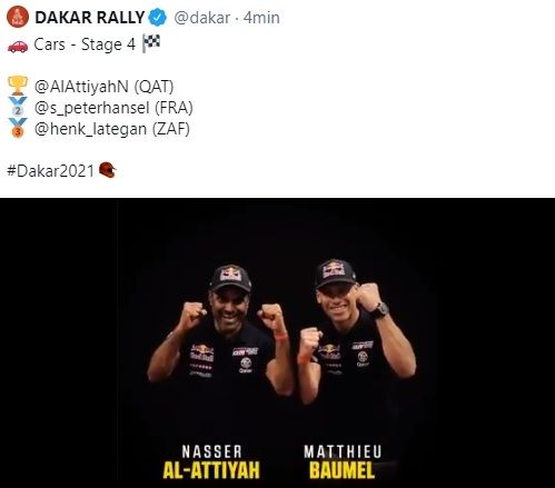 Nasser Al-Attiyah sigue imparable. El piloto qatarí ganó hoy la Etapa 4 del Rally Dakar 2021 y logró su tercer triunfo, de manera consecutiva, en la presente edición, al completar los 337 kilómetros de especial en 2 horas con 35 minutos y 59 segundos, en una emotiva jornada en la que superó por apenas 11 segundos a Stéphane Peterhansel.
