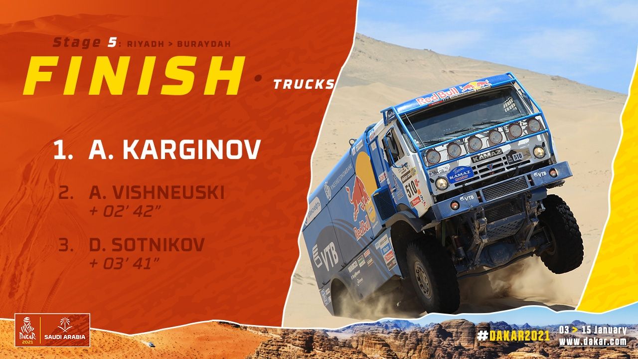 Andréy Karginov vuelve a firmar el mejor tiempo al paso por el km 300. El defensor del título saca poco menos de un minuto a Aliaksei Vishneuski. Martin Macík y su camión, bautizado 'Charles', retroceden a la tercera posición, también a menos de un minuto. El ganador y líder de la general, Dmitry Sotnikov, cede 5’21.