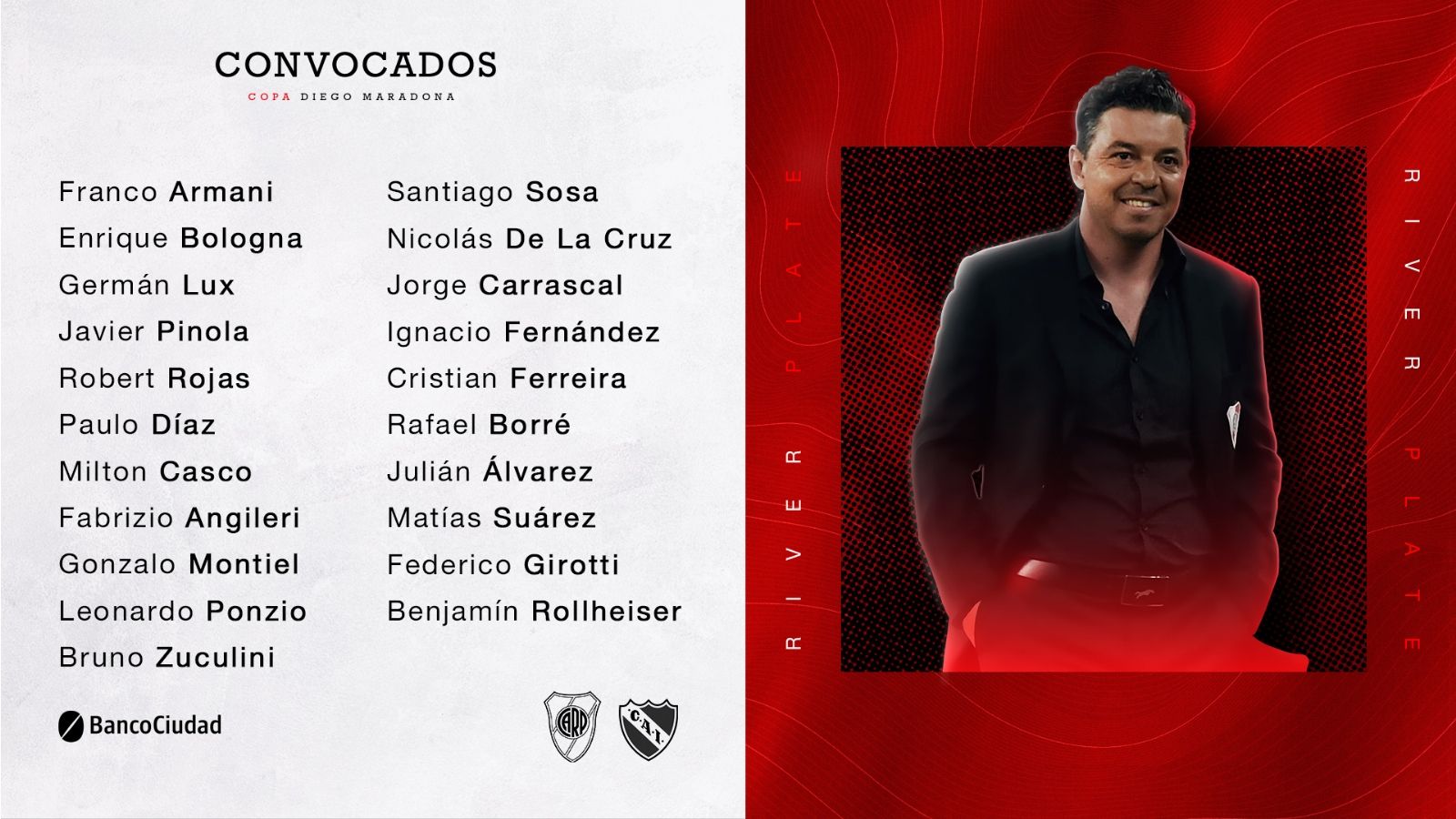 Es que este sábado el Millonario debe recibir a Independiente por la última fecha de la Copa Diego Maradona, buscando ganar y esperar que se den otros resultados para lograr la clasificación a la final del torneo, y hoy confirmó la lista de convocados para dicho encuentro.