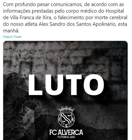 El jugador brasileño Alex Apolinário, del Alverca de la tercera división de Portugal, falleció hoy por muerte cerebral a los 24 años, a cuatro días de desplomarse sobre el campo de juego durante un partido de liga.