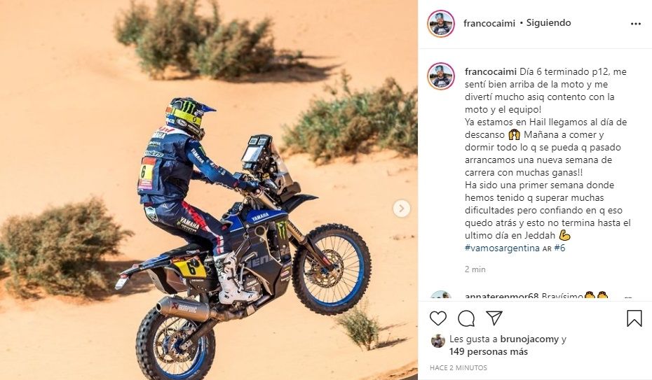 "Ha sido una primer semana donde hemos tenido q superar muchas dificultades pero confiando en q eso quedo atrás y esto no termina hasta el ultimo día en Jeddah", expresó Caimi quien se ubica 16to en el total de tiempos de la categoría que, por el momento, es dominada por el australiano Toby Price (KTM).