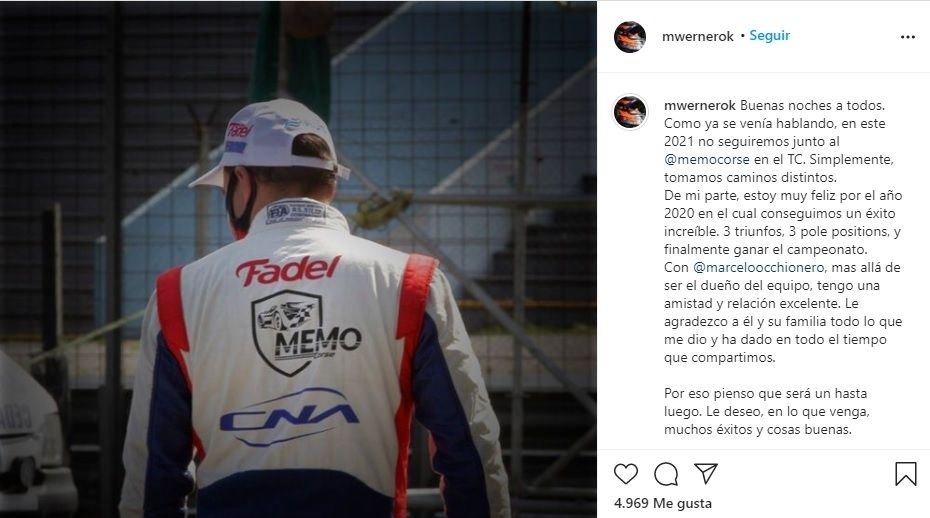 Lo que se venía escuchando como un rumor se hizo realidad: Mariano Werner dejó al equipo campeón de Turismo Carretera. El piloto de Paraná lo comunicó en sus redes y le puso punto final a una novela que venía de varios capítulos. A partir de ahora el entrerriano buscará nuevas oportunidades y algunas informaciones lo vinculan con Omar Martínez.