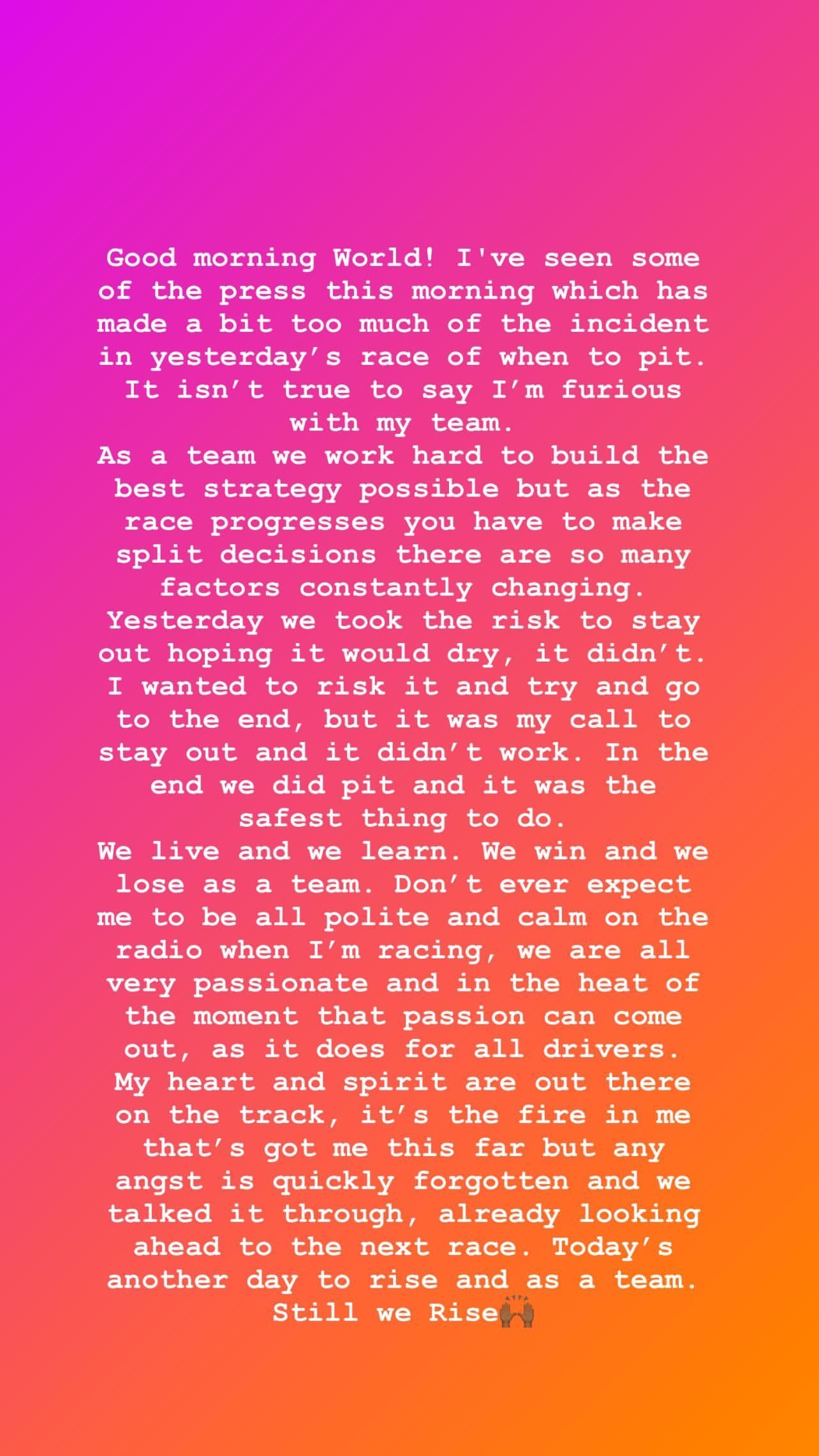 "¡Buena mañana mundo! He visto algunos de la prensa esta mañana, que han hecho demasiado hincapié en el incidente de la carrera de ayer sobre cuándo entrar en boxes. No es cierto decir que estoy furioso con mi equipo", comenzó explicando Hamilton. Y continuó: "Como equipo, trabajamos duro para construir la mejor estrategia posible, pero como la carrera progresa tienes que tomar decisiones divididas, hay tantos factores en constante cambio".