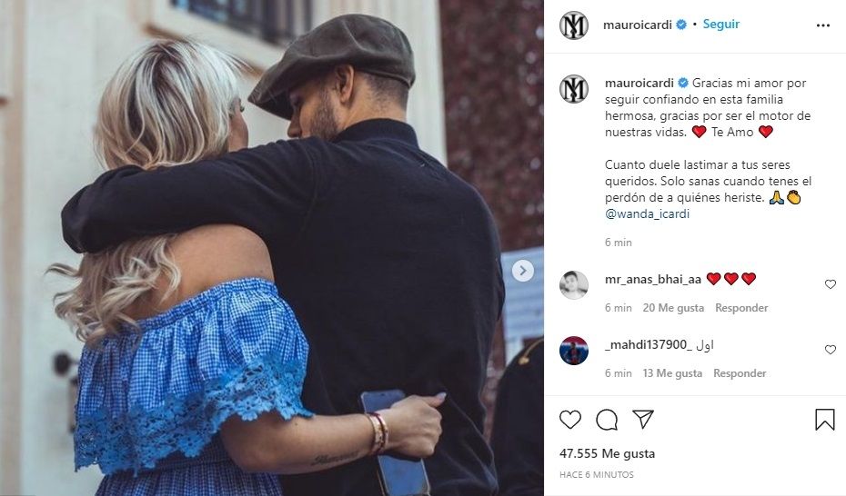 Mauro Icardi confirmó que su relación con Wanda Nara no se terminó. Mediante una conmovedora publicación, el delantero del PSG subió dos fotos con la mediática y escribió sentidas palabras: "Gracias mi amor por seguir confiando en esta familia hermosa, gracias por ser el motor de nuestras vidas. Te Amo".