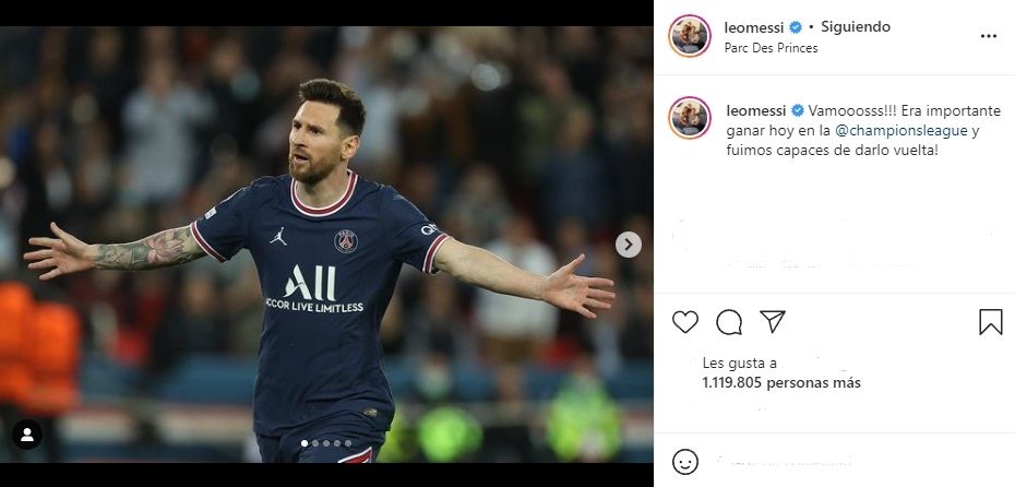 Luego del encuentro con el Leipzig, Leo utilizó su cuenta de Instagram para dejar un eufórico mensaje. "Vamooosss!!! Era importante ganar hoy en la @championsleague y fuimos capaces de darlo vuelta!", escribió y encendió las redes sociales. El posteo, que estuvo acompañado por fotos de su festejo y jugadas del encuentro, superó el millón de likes en veinte minutos.