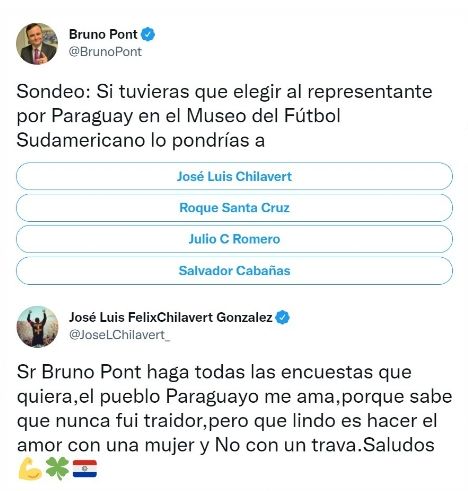 Al parecer, la encuesta no le resultó muy simpática al ex arquero de Vélez Sarsfield y este le respondió en la red social del pajarito: "Sr Bruno Pont haga todas las encuestas que quiera, el pueblo Paraguayo me ama porque sabe que nunca fui traidor pero que lindo es hacer el amor con una mujer y No con un trava. Saludos", escribió Chila.