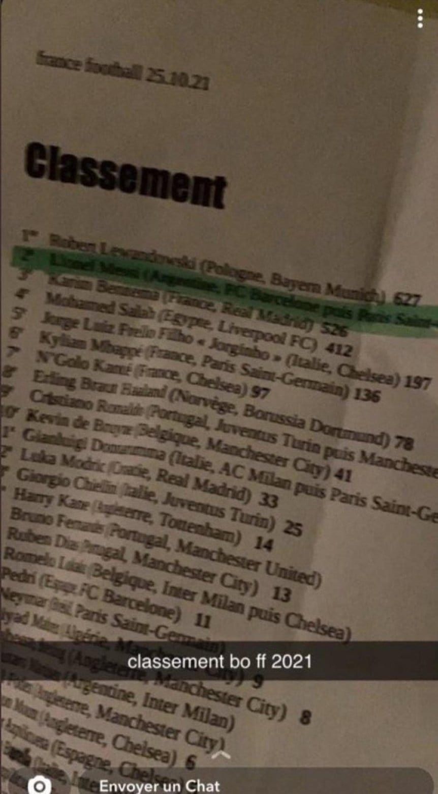 Según la lista filtrada, el polaco Robert Lewandowski sería el ganador del galardón, mientras que Lionel Messi -de quien no se alcanzan a ver los votos- sería su escolta y Karim Benzeman completaría el podio.